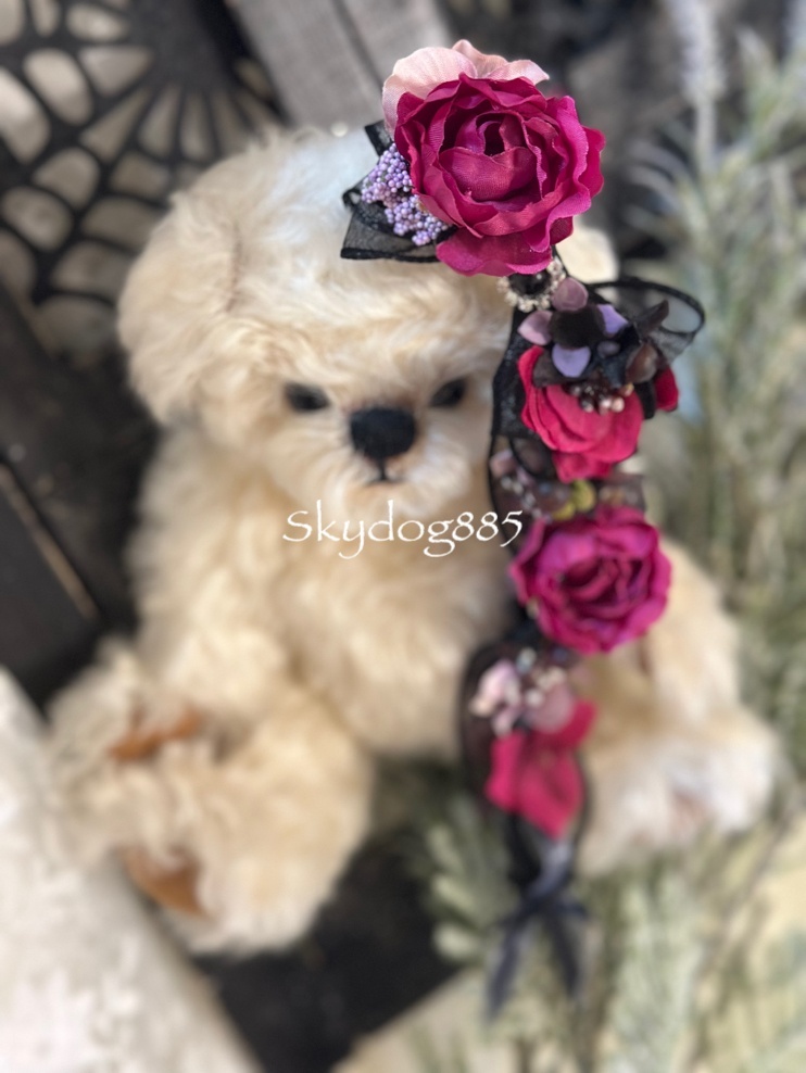 濃いローズピンク(フューシャピンク系)のローズをメインに、ブラックリボンとパープルの小花を合わせたシックで華やかな色合いです♡